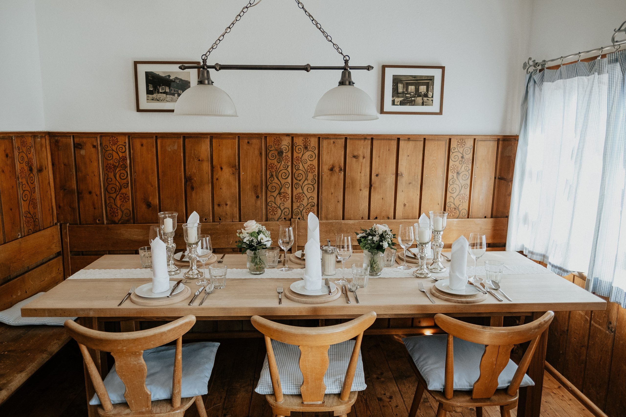 Nachdem wir den Sillberg umrundet hatten, erreichten wir eine weitere Kreuzung, der wir nun nach Rechts zum Sillberghaus folgten. Wir entkamen dem Wald wieder un konnten jetzt den Höhenweg gegenüber von uns auf dem Seeberg sehen. Ziemlich nice! Noch etwas weiter bergab dann die Hütte. Und die war besonders urig! Eine Privatalm mit Swimmingpool und Sommerliegen draußen. Und innen alles aus Nussholz urig gestaltet. Das Wohnzimmer hat gemütliche Couchen und einen Holzofen. Obwohl wir wohl eine Hochzeit störten, durften wir uns Getränke bestellen und uns draußen hinhocken. (Das Haus kann man komplett reservieren, 30 Personen je 50€/Nacht). Die Hochzeitsgäste waren alle in Tracht und es kamen 3 Musiker mit ihren Alphörnern an. So haben wir eine Live-Vorführung der Alphörner miterleben dürfen! Richtig schön!!! Die Sonne kam jetzt langsam raus und auch die Wolken verzogen sich langsam.